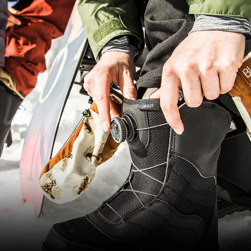 - Система BOA. Новейшая конструкция, которая выполнена из одного или двух специальных колесиков с фиксацией, которые стягивают прочный стальной или синтетический трос. Такая система является самой быстрой по скорости затягивания и абсолютно не требует применять дополнительные усилия. Сноубордические ботинки стягиваются очень плотно и не расслабляются во время процесса катания. Из минусов можно отметить, повышенную стоимость ботинок и уменьшенные зоны действия. Тросик затягивается неравномерно, и если колесико на ботинке одно, то есть возможность перетянуть одну из частей ботинка, в то время как вторая часть останется слабо затянутой. В большинстве случаев стоит рассматривать систему BOA с двумя раздельными застежками у низа и верха.